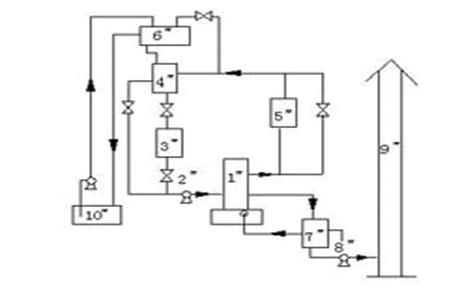 1 導熱油爐 2 熱油泵 3 過濾器 4 汽液分離器 5 加熱用設備 6 膨脹槽 7 換熱器 8 引風機 9 煙囪 10 導熱油儲槽